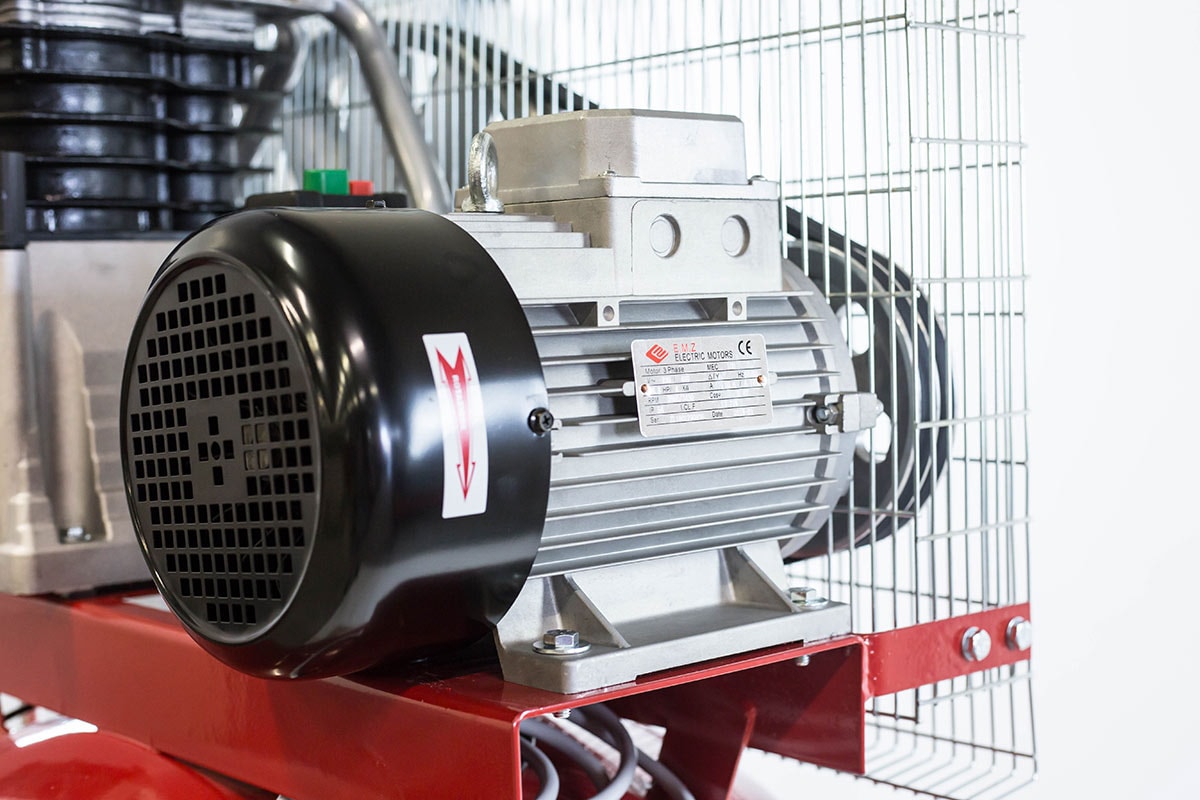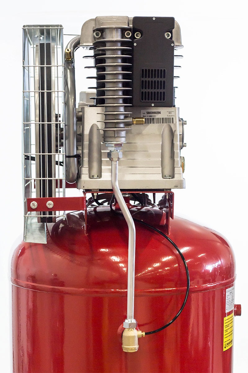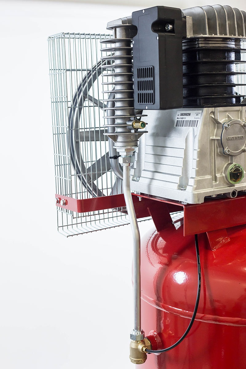 Vertikal kompressor med stående tank. Udstyret med to-trins kompressorblok, Newco NG5, med mellem- og efterkøling og støbejernscylindere. Trykafbryder med motorværn. Reducering ikke inkluderet.